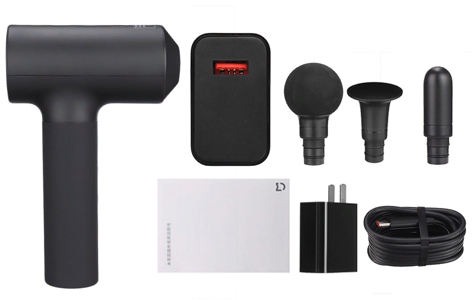 Комплектация | Массажер, зарядный кабель USB Type-C, адаптер питания, сменные насадки 3 шт (круглая головка, плоская головка, насадка-пуля), кейс для хранения, документация |